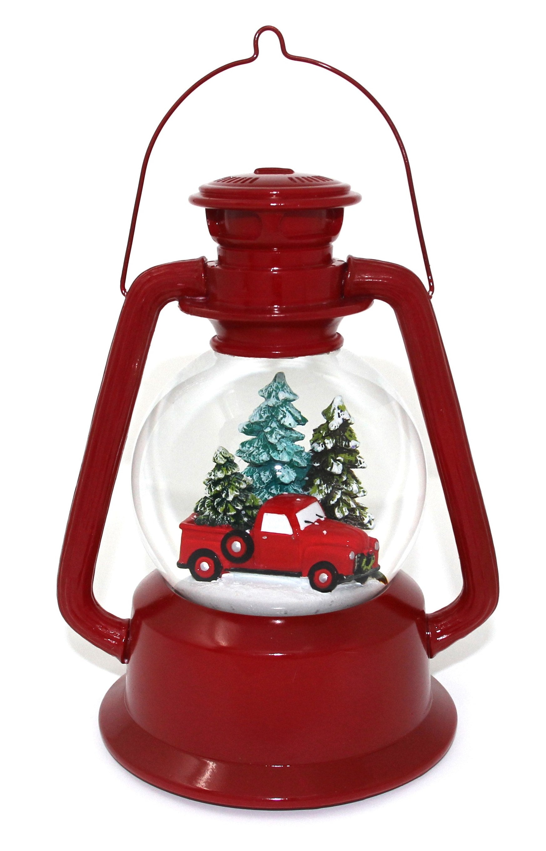 At its core, this snow globe stands at an impressive 100 mm in diameter, creating a mesmerizing snowy scene that is beautifully encapsulated within a rustic lantern-inspired design. The striking feature of this globe is the charming red truck that takes center stage, reminiscent of a classic wintertime scene, with pine trees in the backdrop. The attention to detail in this snow globe is exceptional, from the textured snowflakes to the intricately crafted figurines.