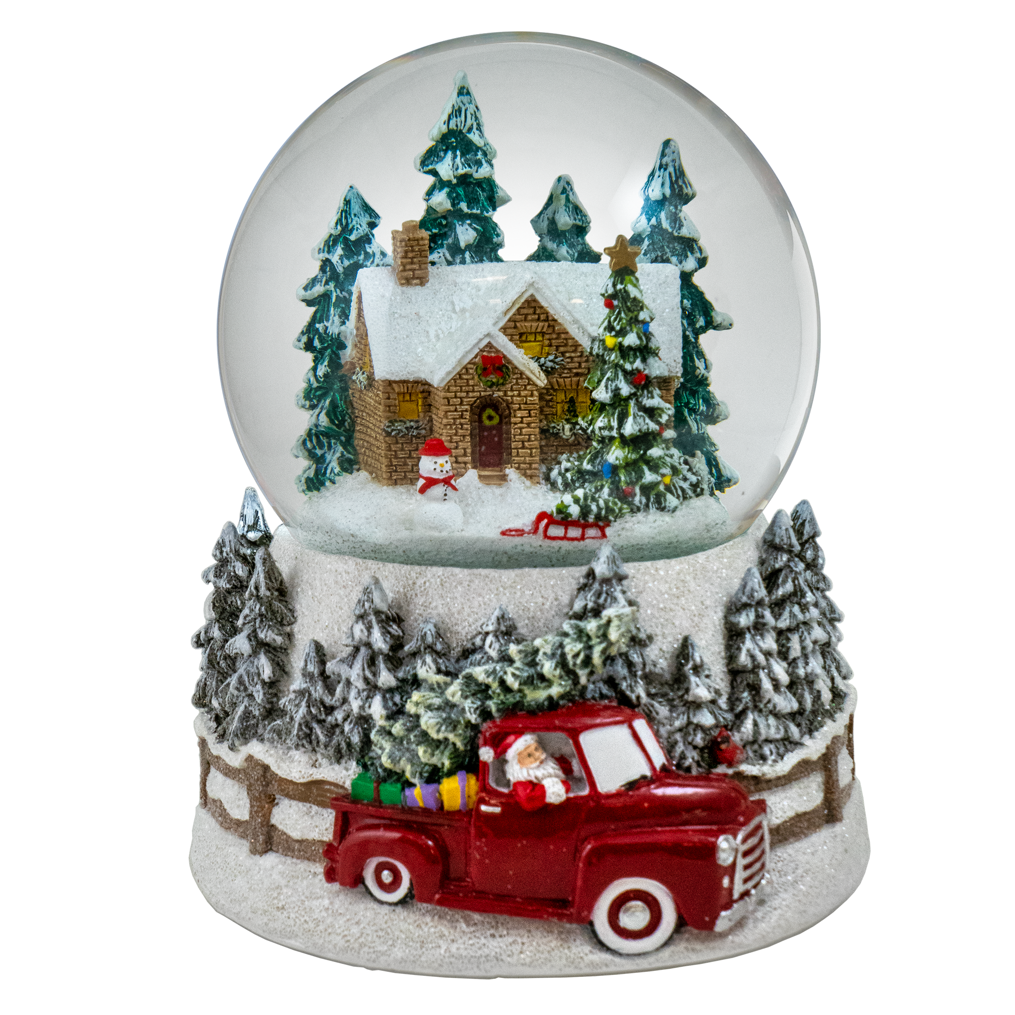The base of the globe is equally charming, showcasing a festive landscape of snowy trees and Santa Claus himself joyfully driving a red truck. The vibrant red truck, a symbol of holiday cheer, perfectly complements the wintry setting, creating a captivating and heartwarming display.
